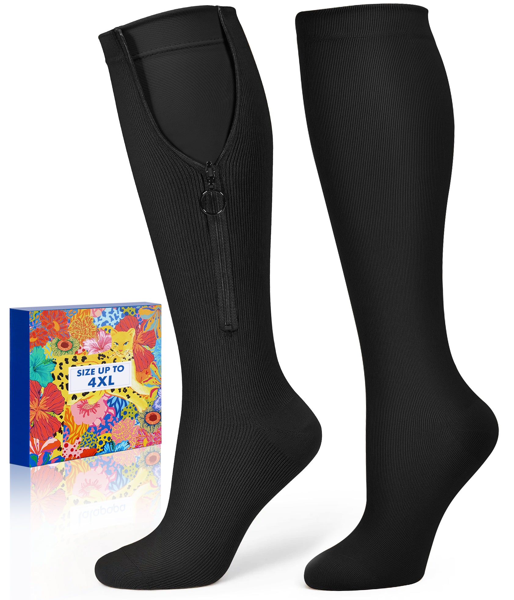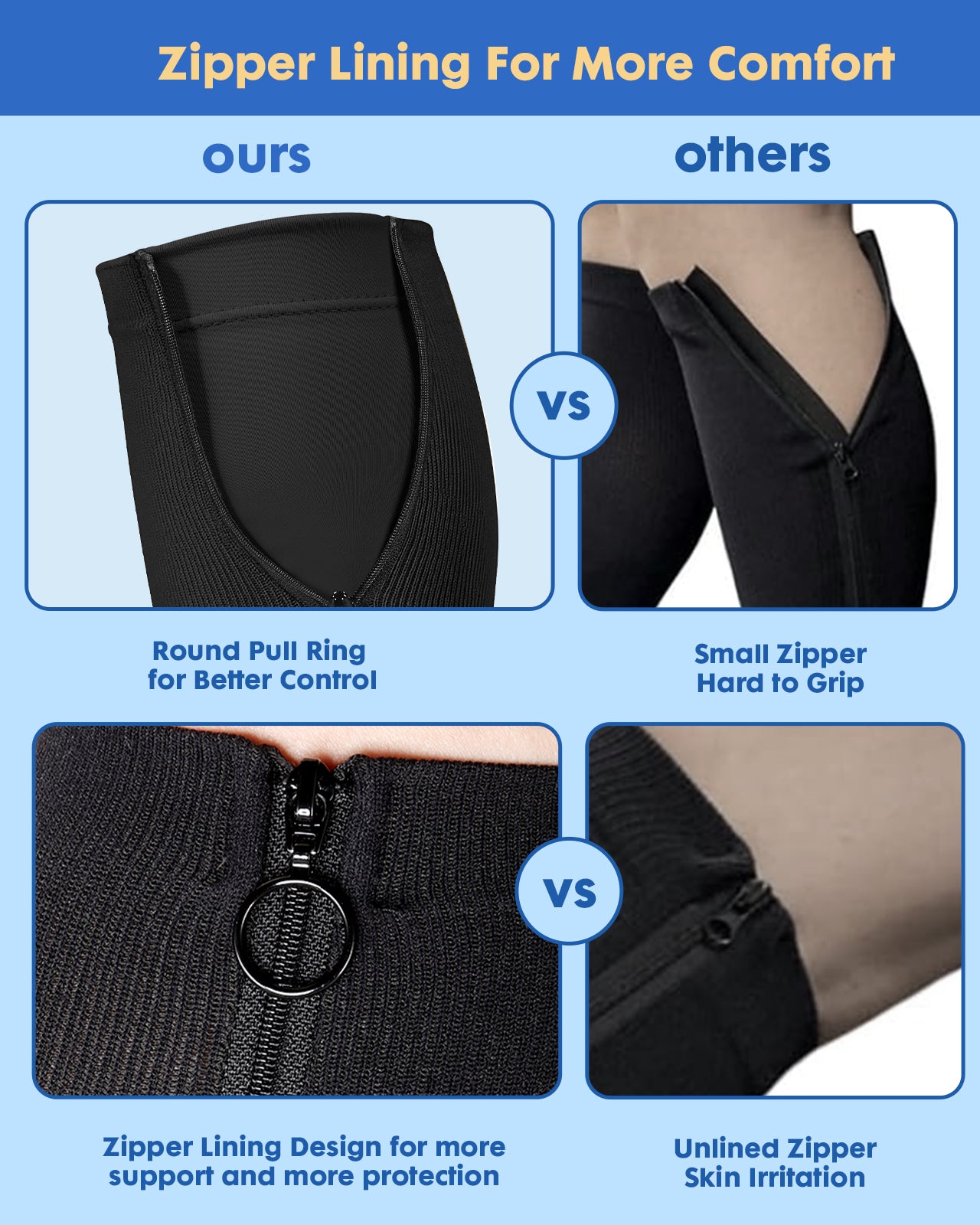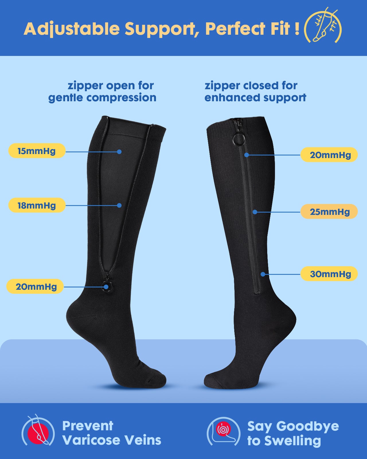 - Inner Lining Zipper Design: The zipper features a soft inner lining that prevents discomfort and enhances wearability. This unique design not only makes the socks easy on and off, but also allows effortless adjustment between pressure levels while ensuring a snug fit and all-day comfort for various activities