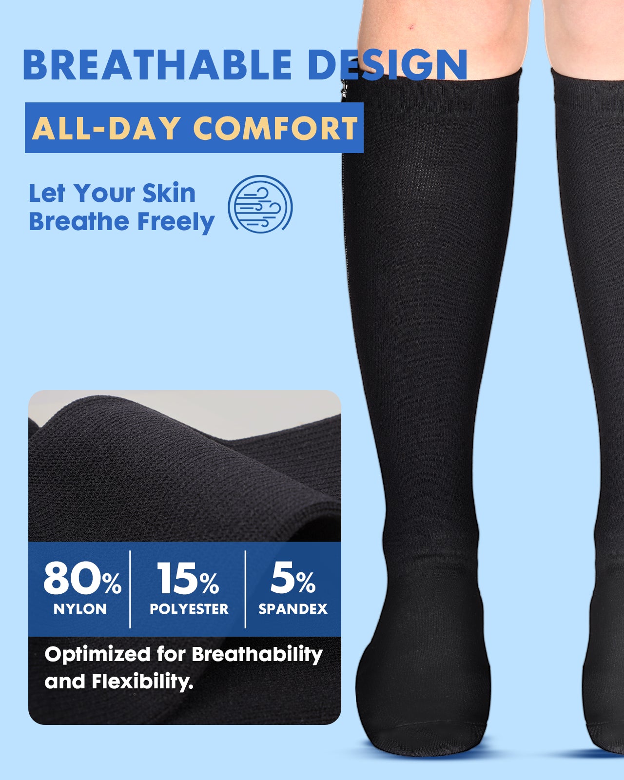 Zipper Compression Socks for Women Men - Compression Socks with Inner Lining Easy On, 20-30mmHg Graduated Support